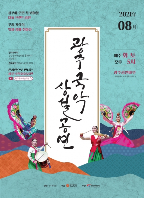 광주문화예술회관은 8월 한 달간 매주 화요일부터 토요일 오후 5시 광주공연마루에서 여름 무더위를 날릴 수 있는 신명나는 국악 공연을 선보인다. 광주국악상설공연은 시립예술단과 지역 예술단체가 참여해 전통국악, 창작국악, 우리춤, 사물놀이 등 다채로운 국악 프로그램을 선보이는 광주 대표 브랜드 공연이다. 8월 첫 번째 주간에는 ‘떠나자! 시원한 국악바캉스’를 주제로 코로나19로 여름휴가를 떠나지 못한 시민을 위해 실내에서 시원하게 즐길