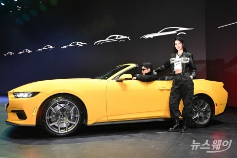 포드코리아가 15일 오전 경기 광명시 아이백스 스튜디오에서 열린 7세대 올-뉴 포드 머스탱 쇼케이스에서 '2.3L EcoBosst Convertible' 신차량을 선보이고 있다. 포드의 머스탱은 지난 1964년 1세대의 글로벌 첫 등장 이후 올해 60주년 맞이했다. 이를 기념하기 위해 이번 자리가 마련됐다. 올-뉴 포드 머스탱의 가격은 △2.3L 에코부스트 쿠페 5,990만 원 △컨버터블 6,700만 원 △5.0L GT 쿠페 7,990만 원 △컨버터블 8,600만 원이다.