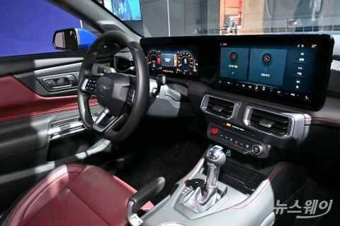 포드코리아가 15일 오전 경기 광명시 아이백스 스튜디오에서 열린 7세대 올-뉴 포드 머스탱 쇼케이스에서 '5.0L GT Coupe' 신차량을 선보이고 있다. 포드의 머스탱은 지난 1964년 1세대의 글로벌 첫 등장 이후 올해 60주년 맞이했다. 이를 기념하기 위해 이번 자리가 마련됐다. 올-뉴 포드 머스탱의 가격은 △2.3L 에코부스트 쿠페 5,990만 원 △컨버터블 6,700만 원 △5.0L GT 쿠페 7,990만 원 △컨버터블 8,600만 원이다.