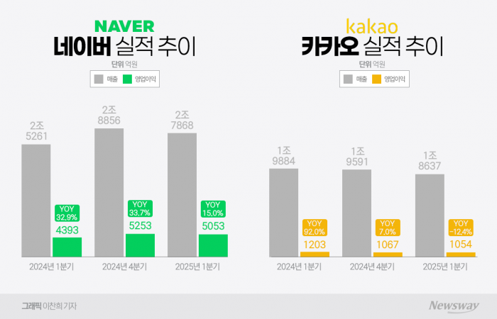 게다가 카카오는 대표 사업 중 하나인 포털 부문도 역성장하며, 검색 부문이 호실적을 견인한 네이버와 상반된 모습을 보였다.