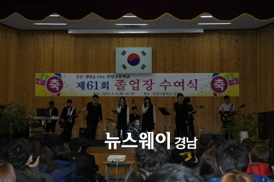 졸업식이 시작되기 직전인 오전 10시가 되자 저마다 꽃단장을 한 남녀 학생과 학부모가 강당으로 모여들기 시작했다. 경상남도종합학예제에서 최우수상을 수상한 바 있는 합창단의 축가가 울려 퍼지는 가운데 입장한 졸업생들이 자리에 앉자 후배들은 춤과 노래로 축제 분위기를 돋우었고 학교 밴드부의 열창에 함께 어울려 노래하고 박수치는 모습에 학부모들도 덩달아 신이 날 정도였다.