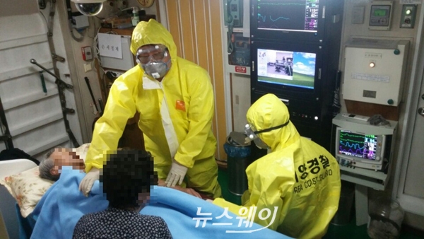 해경은 최인근 경비함정을 급파해 정 씨를 태우고 해양원격의료시스템을 가동해 환자상태를 점검한 결과 탈수 및 마비증세가 있어 말을 잘 못하고 거동이 불편해 시급한 치료가 필요했다.