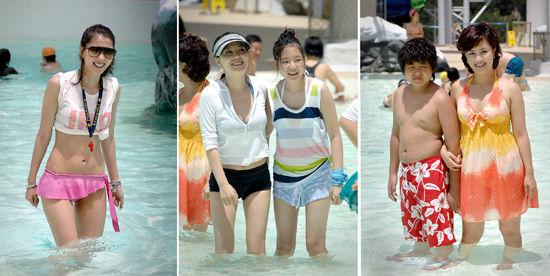 【서울=뉴스웨이 최가람 기자】MBC 일일드라마 <밥 줘>의 세 자매 김혜선-하희라-오윤아가 최근 온천으로 물놀이를 하는 장면을 촬영했다. 실제로 아이 엄마인 한 세 사람은 아줌마답지 않은 날씬한 몸매로 개성 있는 수영복 맵시를 뽐냈다.