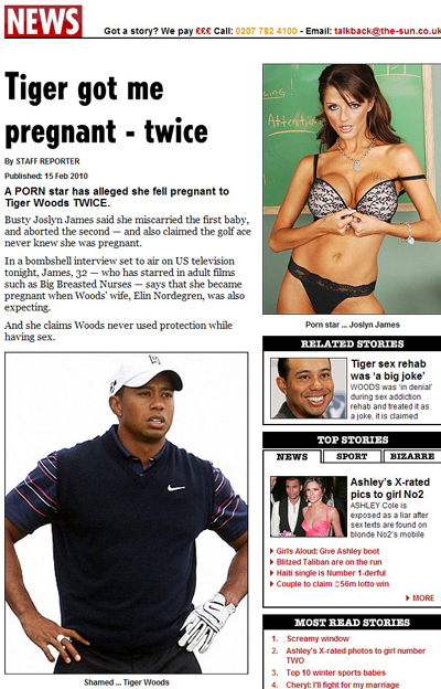 포르노 배우로 알려진 제임스는 미국의 TV쇼 '인사이드 에디션'에 출연해 "우즈와 밀애를 즐기는 동안 피임은 한번도 하지 않았다"며 "우즈의 아이를 두번이나 임신했다"고 고백해 청중의 놀라움을 샀다.