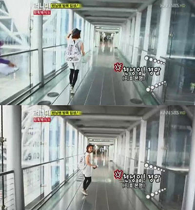 이에 하하가 "천성임 너 정말"이라고 외치며 송지효의 본명을 밝혔고 송지효는 순간 뒤를 돌아보며 웃음을 터뜨려 당황한 기색을 보였다. 하지만 아무런 대꾸 없이 앞만 보며 질주해 웃음을 자아냈다.