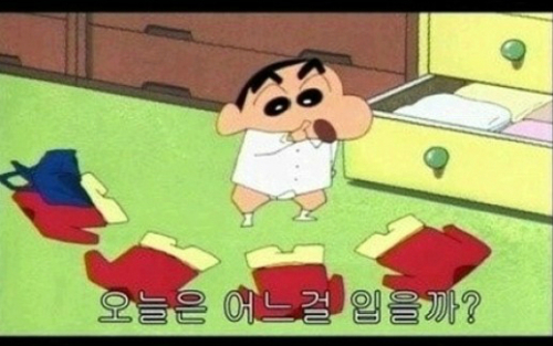 공개된 사진에는 짱구가 여러벌의 옷을 늘어놓고 "오늘은 어느걸 입을까?"라며 고민을 하고 있다.