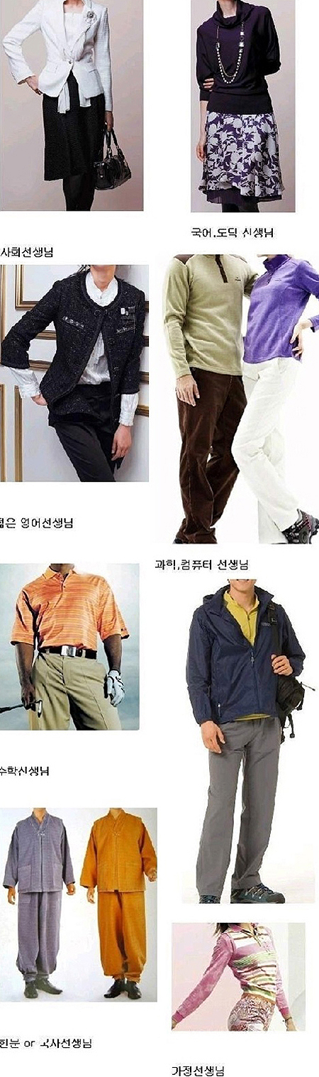 공개된 사진에는 과학·컴퓨터선생님, 기술선생님, 국어·도덕선생님, 한문·국사 선생님 등의 특징과 잘 어울리는 의류사진과 매치했다.