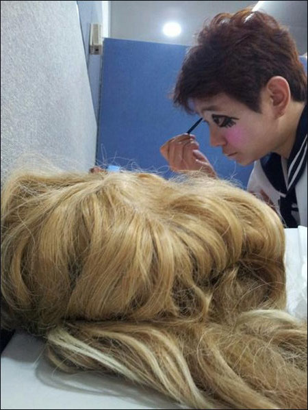 사진에는 박성호가 갸류상 가발을 옆에 두고 분장을 하고 있다.