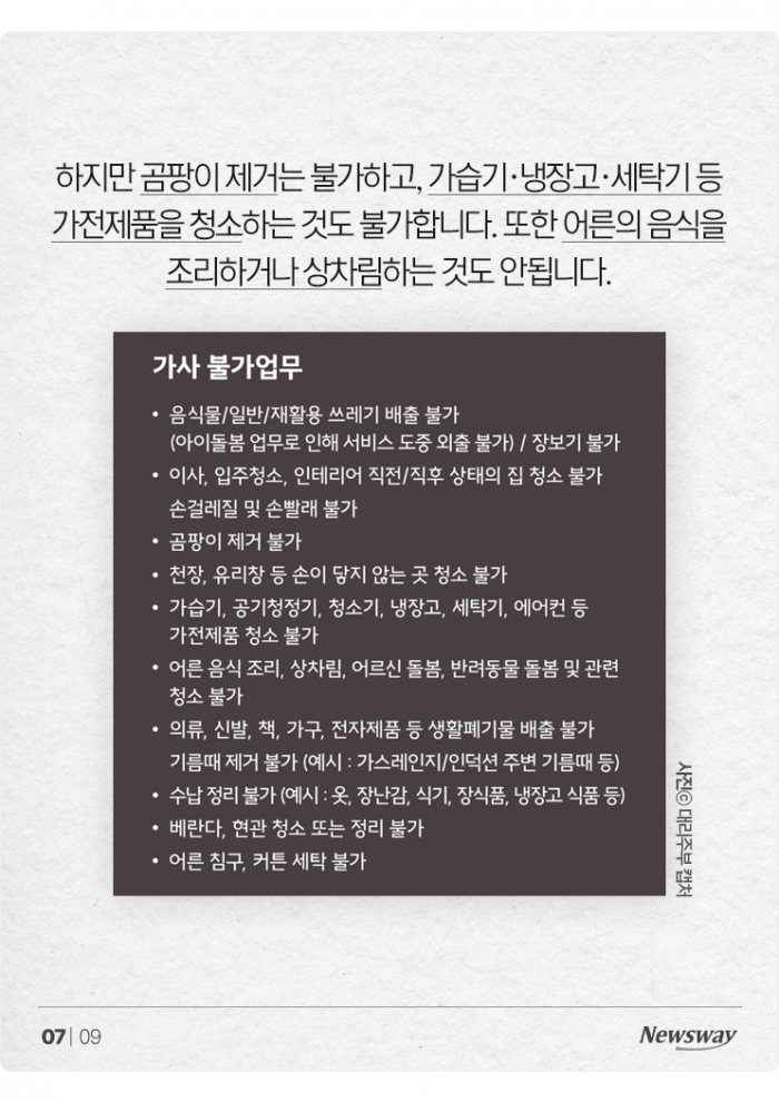 하지만 곰팡이 제거는 불가하고, 가습기·냉장고·세탁기 등 가전제품을 청소하는 것도 불가합니다. 또한 어른의 음식을 조리하거나 상차림하는 것도 안됩니다.